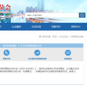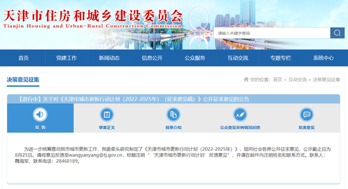 意见征求截止日期为2022年8月25日,可通过电子邮件wangyanyang@tj.gov.cn进行反馈,标题注明“‘天津市城市更新行动计划’反馈意见”,并请在邮件内注明姓名和联系方式。联系人:魏海军,联系电话:28468189。