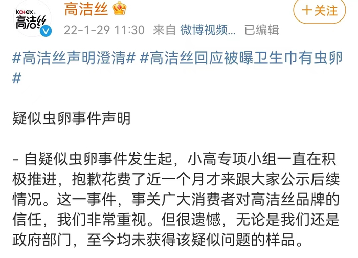 针对疑似虫卵事件,高洁丝方回应称,消费者未提供样品以举证调查,并自行确认撤销了本次投诉,微博联系消费者确认事实,并承诺可以邀请第三方公证人员全程公证,但最终该消费者未提供联系方式及未再回复消息。