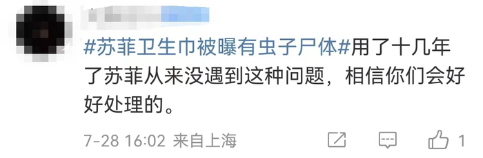 部分网友表示不理解:“卖这么贵的东西怎么就连基本的卫生安全也不能保障?”不过也有网友表示,用了十几年苏菲没遇到过这种问题,相信苏菲会好好处理。