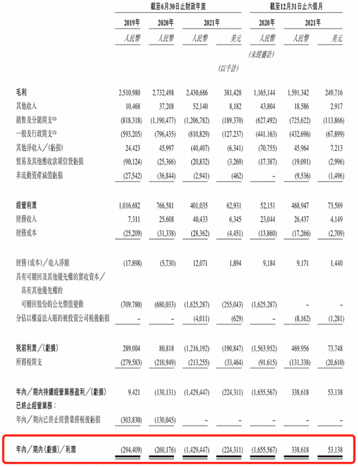 美股暴跌与港股破发的背后,是名创优品陷入滞胀的营收和巨额的亏损。财务数据显示,2019财年至2021财年(截至2021年6月30日),名创优品营收分别为93.95亿元、89.79亿元及90.72亿元,营收增速明显陷入停滞;净亏损分别为2.94亿元、2.6亿元、14.29亿元,近三年累计亏损近20亿元。