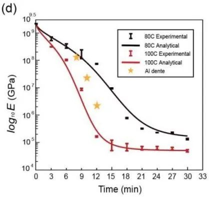第二阶段,意面从玻璃态转变为橡胶态,杨氏模量会在短短几分钟内迅速下降几个数量级(通俗地说,意面在这个阶段软的特别快);