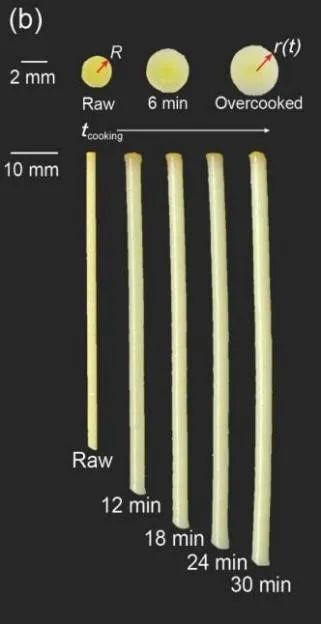 来自伊利诺伊大学厄巴纳-香槟分校的研究者Sameh Tawfick就带领团队研究了煮面过程中意面的膨胀、软化、粘结等物理变化,建立了意面的膨胀动力学模型,并用实验验证了该模型。