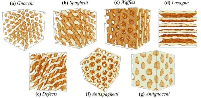 泡沫状分布结构比作意大利团子,长条状结构比作意大利面,有孔的多层平行结构比作华夫饼,没有孔的比作千层面等等。这些结构会随中子星内部压力变化而相互转变。
