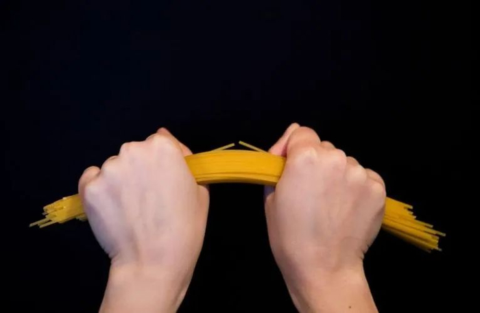 在意面的两端施加压力,它会在中间弯曲度最大的位置折断。因为惯性,断裂后的意面会向反方向弯曲,直至恢复笔直。弯曲状态在极短时间内发生变化,会在意面中激发强烈的振动波,从而进一步使面条断裂成更多节。