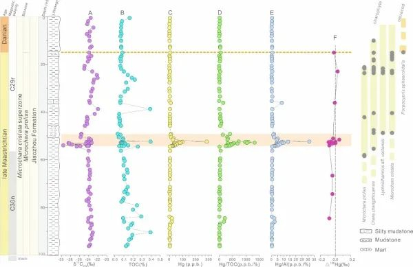 图2. 胶莱盆地徳干大火成岩省在陆相地层中的层位标定:(A)δ13Corg;(B) TOC;(C)Hg;(D)Hg/TOC;(E)Hg/Al;(F)Δ199Hg。水平橙色矩形代表汞峰值区间,橙色虚线代表根据轮藻生物带和介形类化石标定的K/Pg界线;灰色圆点和黄色/橙色条带分别代表发现轮藻和介形类的化石层位、以及它们的延限分布