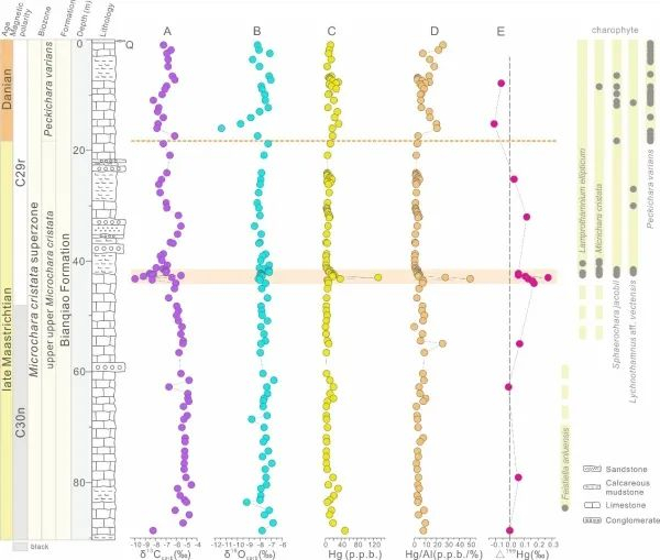 图3.平邑盆地徳干大火成岩省在陆相地层中的层位标定:(A)δ13Ccarb;(B) δ18Ocarb ;(C)Hg;(D)Hg/Al;和(E)Δ199Hg。水平橙色矩形代表汞峰值区间,橙色虚线代表根据轮藻生物带标定的KPg界线;灰色圆点和黄色/橙色条带分别代表发现轮藻和介形类的化石层位、以及它们的延限分布