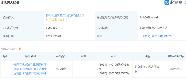 今年3月4日,伟光汇通旅游产业发展有限公司成为被执行人,案号为(2022)京0108执2907号,执行标的为550.5万元。