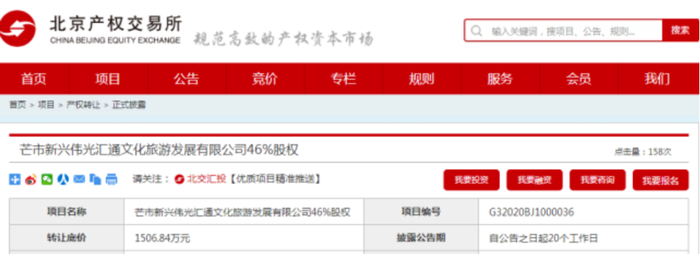 此前,在央企、国企“退房”回归主业背景下,2020年,伟光汇通在云南芒市傣族古镇项目的央企合作方――新兴发展集团有限公司曾以底价1506.84万元转让所持芒市新兴伟光汇通文化旅游发展有限公司46%股权,并于去年4月27日完成退出。