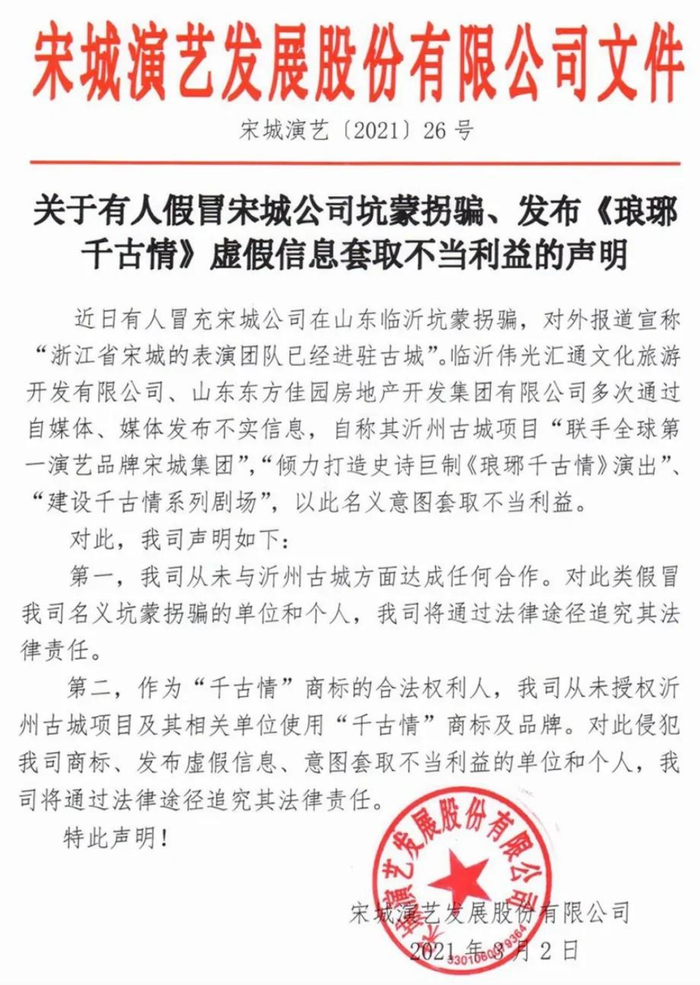 公告显示,宋城演艺从未与沂州古城方面达成任何合作,也从未授权沂州古城项目及其相关单位使用“千古情”商标及品牌。公司拟通过法律途径追究有关单位和个人的法律责任。