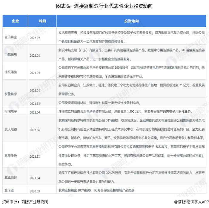 2021年以来,连接器制造行业代表性企业的投资动向主要包括收购公司拓展业务、通过对子公司增资的方式投资连接器生产基地项目。连接器制造行业代表性企业最新投资动向如下: