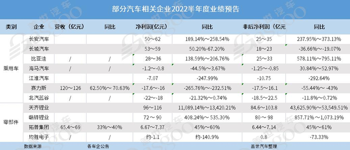 不同于长安、长城和比亚迪等,北汽蓝谷、赛力斯既没有大规模销量支撑,也没有大笔非经营性损益入账。如此在疫情、原材料上涨等外部因素的冲击下,净利润亏损进一步扩大。北汽蓝谷上半年净利润亏损高达18亿~22亿元,赛力斯也处境类似(亏损超16亿元)。