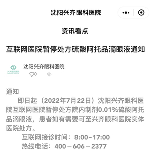 近日(7月22日),沈阳兴齐眼科医院发布一则《互联网医院暂停处方硫酸阿托品滴眼液通知》。根据通知,自即日起(2022年7月22日)沈阳兴齐眼科医院互联网医院暂停处方院内制剂0.01%硫酸阿托品滴眼液(也称低浓度阿托品),患者如有需要可至兴齐眼科医院实体医院处方。这一公告坐实了此前传得沸沸扬扬的低浓度阿托品院内制剂即将停止互联网销售的消息。