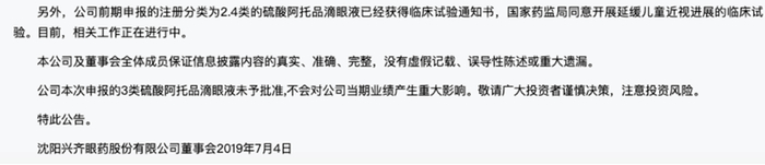 2018年,兴齐眼药的阿托品药物以化药2.4类新药获得临床试验审批,2.4类新药为含有已知活性成份的新适应症的制剂,该临床试验申请的适应症为延缓儿童近视进展。
