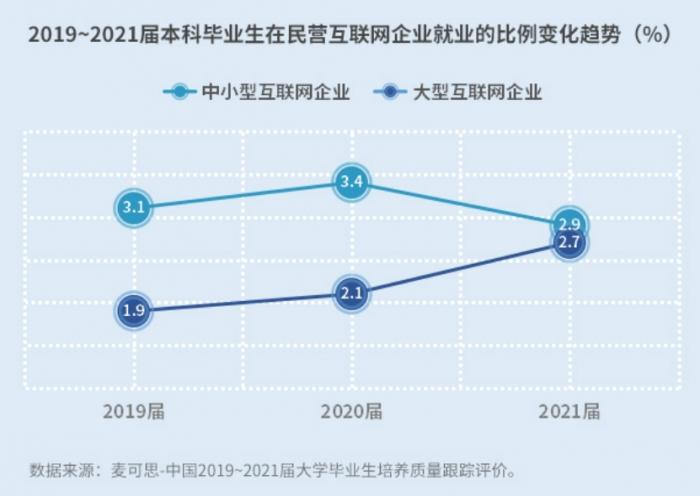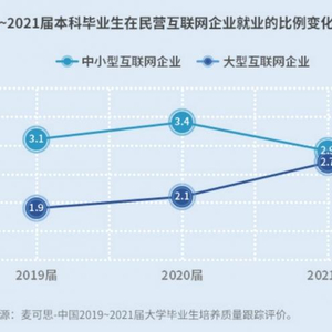 值得注意的是,应届本科生在中小型互联网企业就业的比例出现下降,2021届(2.9%)相比2020届(3.4%)降低0.5个百分点,下降幅度达到15%;在大型互联网企业就业的比例有所上升,2021届(2.7%)比2020届(2.1%)高了0.6个百分点。