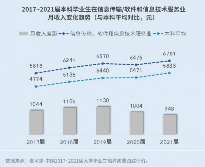 就业蓝皮书数据显示,信息传输、软件和信息技术服务业已连续五年领跑行业薪酬榜,在2021届达到6781元,比同届本科生平均月收入(5833元)高出948元,但涨幅偏低。