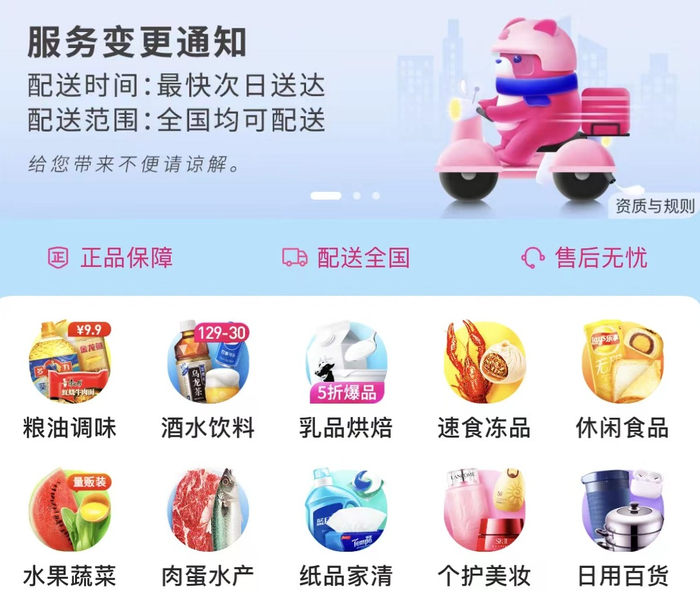 记者注意到,目前每日优鲜App上的商品分类页面也与此前有所不同。粮油调味、酒水饮料、乳品烘焙、休闲食品等品类被前置,此前曾排在靠前位置的水果蔬菜、肉蛋水产等品类则被排在了后面。蔬菜品类也有所变化,商品都变成适合快递运输的“云超特卖”商品,少了很多以前售卖的普通叶菜等平价蔬菜,所有商品最快送达时间则都变更为“最快次日送达”。