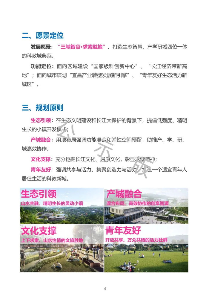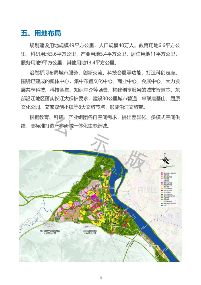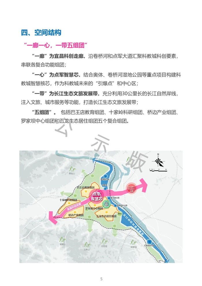 依托点军区优越的区位、产业优势和科教、生态资源,围绕“宜昌产业转型发展新引擎、青年友好生态活力新城区、国家级区域科创新中心、长江经济带科教新高地”的功能定位,规划建设用地规模49平方公里、人口规模40万人,构建了“一廊一心,一带五组团”的空间格局及“一年打基础、三年见成效、五年大发展、十年立标杆”的开发时序,着力将宜昌科教城打造成集生态引领、产城融合、文化支撑、青年友好的“三峡智谷、求索胜地”。