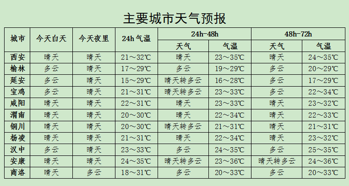 2日: 全省多云间阴天,陕北大部、关中西部部分和陕南部分地方有阵雨或雷阵雨,榆林北部有大雨。关中南部部分、陕南部分地方有35℃以上的高温天气。