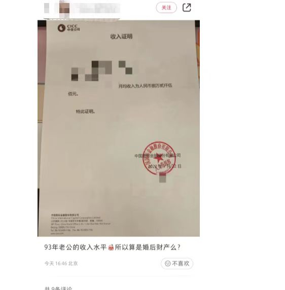 7月28日,这位网友在小红书平台晒出其配偶月均82500元的中金公司收入证明,并附疑问:“93年老公的收入水平,所以算婚后财产吗?”。