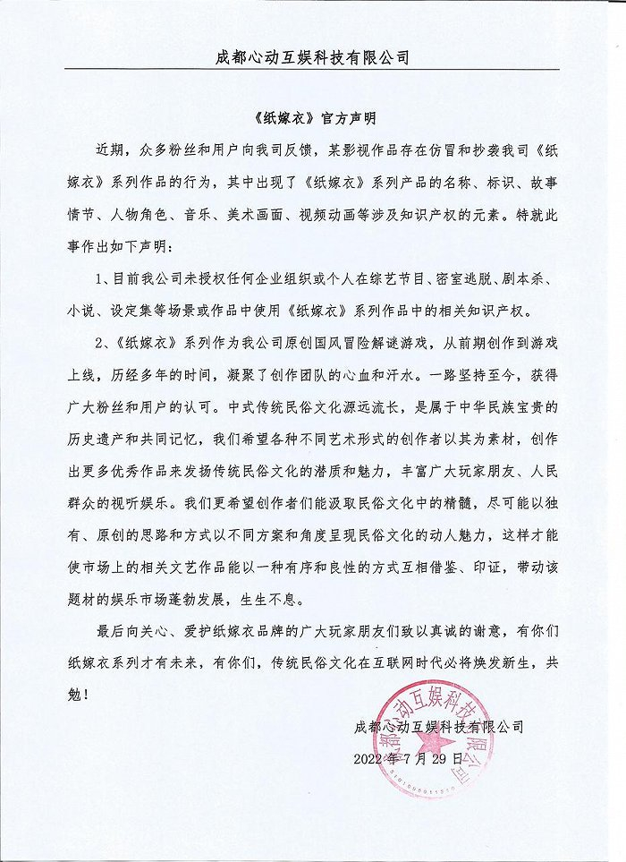 7月29日,手游《纸嫁衣》官微发布声明称,目前公司未授权任何企业组织或个人在综艺节目、密室逃脱、剧本杀小说、设定集等场景或作品中使用《纸嫁衣》系列作品中的相关知识产权。