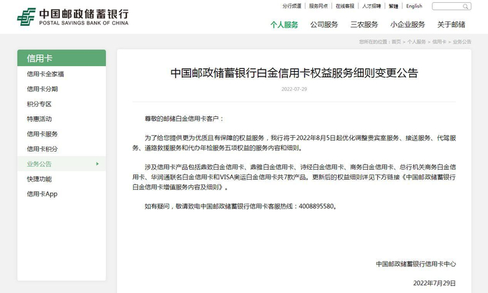 7月29日,中国邮政储蓄银行发布“白金信用卡权益服务细则变更公告”。