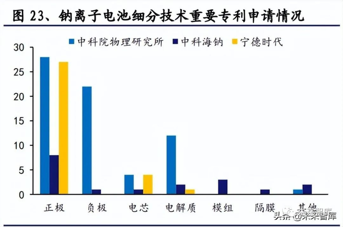 生产研发齐头并进,正极材料是重点。基于专利数量的技术发展趋势通常遵循“新 兴-成长-成熟-饱和”四个连续的阶段。开发前阶段的特点是年度专利数量呈指数 增长,而成长阶段的特点是公司已经在对技术进行整合和商业化,因此专利新增 数量下降。钠离子电池每年的专利申请数量直到 2019 年一直保持急剧增长,之后 便呈下降趋势,标志着钠离子电池技术进入成长阶段,国内机构缩减研究并聚焦 于商业化应用。从专利细分技术来看,国内的宁德时代和中科院物理所(中科海 钠)研究重点均放在正极上,中科院物理所(中科海钠)又在钠离子电池正极、 负极、电解质、隔膜、电芯、模组等技术领域均布局多项专利。