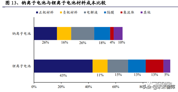 钠离子电池的材料成本相比于锂离子电池有 30-40%的下降空间。根据中科海钠提 供的数据,磷酸铁锂电池的材料成本约为 0.43 元/Wh,铜基钠离子电池的材料成 本约为 0.29 元/Wh,如果不考虑回收则为 0.40 元/Wh,略低于磷酸铁锂电池。钠 离子电池与锂离子电池的材料成本差异主要体现在:1)正极铜铁锰氧化物的成本 为磷酸铁锂的 1/2 左右;2)煤基碳负极材料成本不到锂电池石墨的 1/10;3)钠 电池可使用低浓度电解液降低电解液成本;4)同等容量的钠电池中铝箔集流体成 本是锂电池铝箔+铜箔集流体的 1/3。