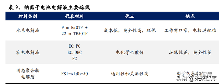 钠离子电池使用钠盐电解质,并不会颠覆现有锂电体系电解质格局。钠离子电池 仍以液体非水系电解液为主,根据正极材料搭配六氟磷酸盐或高氯酸盐电解质。钠离子电池电解液与锂离子电池电解液配方相似,均由电解质、溶剂和添加剂组 成,最大的区别是电解质由锂离子变为钠离子。六氟磷酸钠的生产反应工艺、设 备和过程成本和六氟磷酸锂基本一致,区别仅是其原料用钠盐替代了碳酸锂。天赐材料、新宙邦、多氟多等公司已拥有钠离子电解液的技术储备,钠离子电池电 解液的生产体系可全部沿用现有锂离子电池体系,可共享产能。