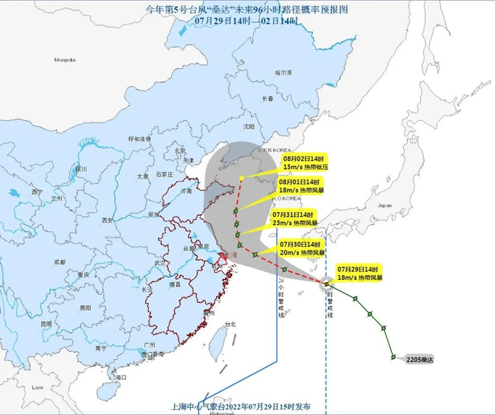 预计,“桑达”将于本周五(今日)夜间移入东海海域,本周六(30日)夜间到周日(31日)白天将在上海东部海域徘徊少动,31日夜间逐渐转向偏北方向移动,强度逐渐减弱,趋向朝鲜半岛。