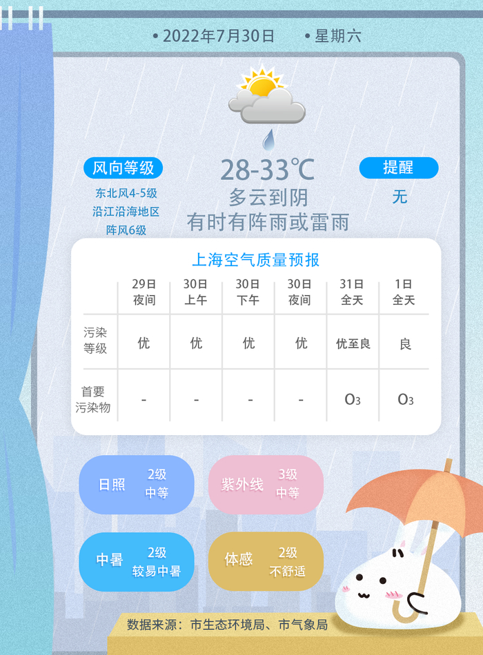 8月1日(周一):多云到阴有分散性阵雨或雷雨,28~33度