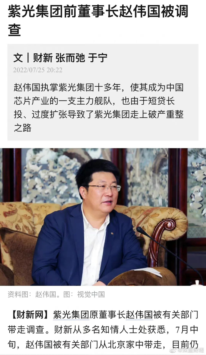 除了三位大基金高管被查外,在芯片领域,另一位接受调查的紫光集团前董事长兼总经理赵伟国也颇为引人关注。不同信源均称,赵伟国身涉调查或与其个人所控公司和原紫光集团旗下公司之间利益输送相关,比如设备采购、装修工程等未经公开招投标的问题。