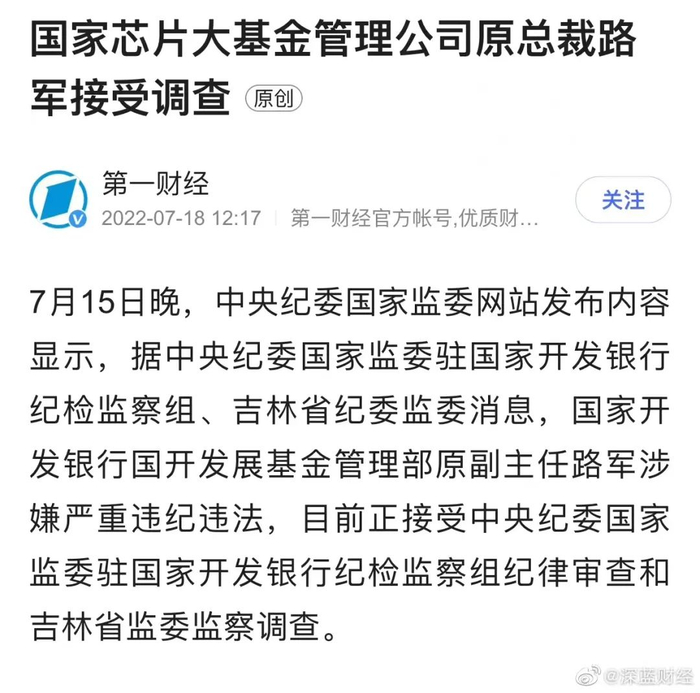7月17日,据中央纪监委驻国家开发银行纪检监察组消息,国家开发银行国开发展基金管理部原副主任、国家大基金管理公司原总裁路军涉嫌严重违纪违法,目前已正在接受中央纪委国家监委驻国家开发银行纪检监察组纪律审查和吉林省监委监察调查。由于路军最广为人知的经历是曾参与大基金投资,因此在当时就有敏感的市场人士认为“芯片反腐”或拉开序幕。