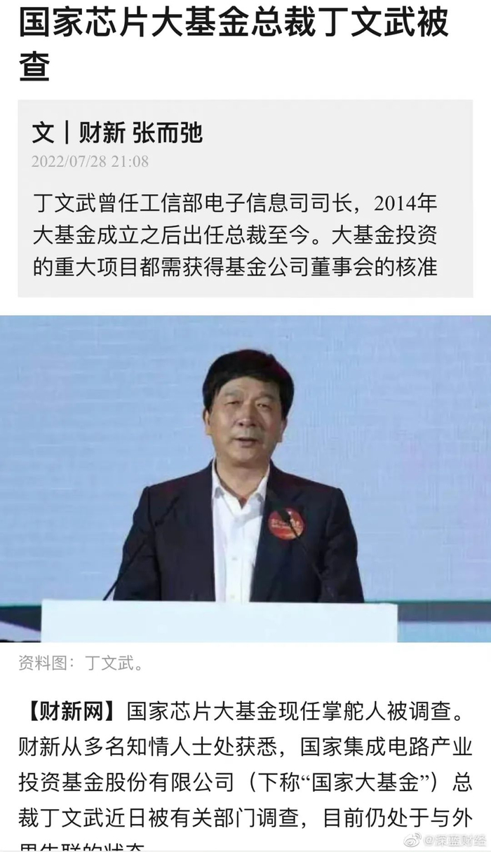 7月28日晚间,据多家媒体报道,中国集成电路产业投资基金股份有限公司(下称“大基金”)总裁丁文武被有关部门调查,目前仍处于与外界失联的状态。