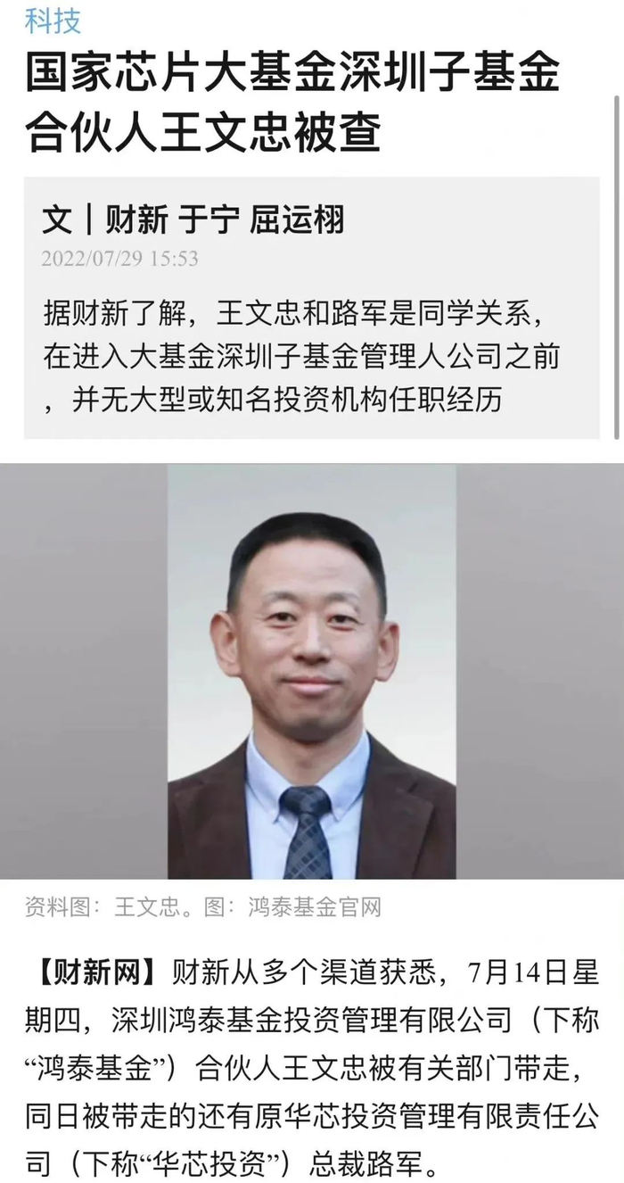7月29日,财新报道指出,国家芯片大基金深圳子基金合伙人王文忠被查,据了解王文忠和路军是同学关系,在进入大基金深圳子基金管理人公司之前,并无大型或知名投资机构任职经历。