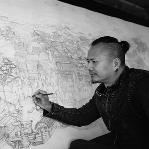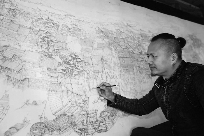 为此,早在2019年,他便和当地十余位艺术家一起,到各地采风,最终确定了这一鸿篇巨制的主题。而用铅笔绘制草图只是雕刻的前奏,现在他们夫妻二人正在绘制更为精细的25米长的水墨正稿,等五六个月完稿后,才会真正开始雕刻。