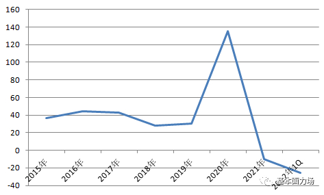 维海德业绩爆发则是在2020年,收入同比翻了一番以上,净利润过亿,让公司的经营体量有了质的变化,但是随后在2021年和今年一季度又有所颓势。将2015年以来各期营业额同比增速画一条曲线,就能够看出2019年之后巨大的波动: