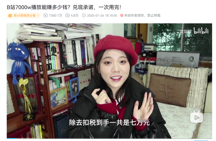 头部UP主“宝剑嫂”创作7000万播放量的视频,税后获得七万元收益。