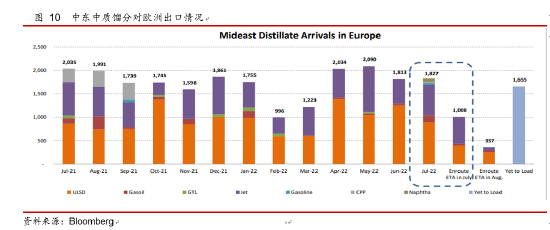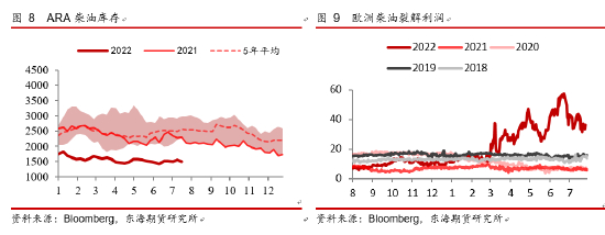 由于俄罗斯柴油供应的环比减少,近期自中东到欧洲的中质馏分运量环比大幅增加。低硫柴油和煤油等中质馏分在7月的运量已接近正常月份运量的1.5倍。所以从库存来看,目前的柴油库存仍然处在极低位置,但是后期的供应上,一方面欧洲原油缺口将会受到来自美国出口增量的缓和影响,炼化原料成本上将有所降低,叠加近期的消费弱势,裂解利润上已经有所体现;另一方面其他地区的成品油出口将逐渐对欧洲成品油缺口形成一定填补,尤其是在中东夏季消费旺季过后。