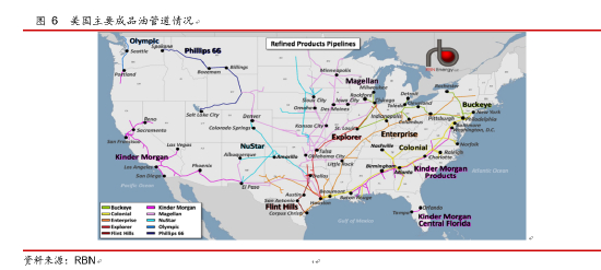 另外可以佐证这一点的仍然是现货方面的基差情况。成品油管道价差方面,可以从Colonial管道情况入手。作为美国最为重要的成品油管道,Colonial分两段连接了休斯顿至新泽西的林顿,其中第一段连接至北卡的格林斯伯勒,其中汽油运量140万桶/天,柴油运量为120万桶/天,第二段连接至林顿,混运总运能为88.5万桶/天,同时分段连接巴尔的摩附近的多西港,运能为70万桶/天。作为连接PADD 3和PADD 1最重要的成品油管道,其管道价差可以在相当程度上体现成品油现货水平。