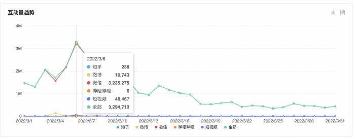 不过,互动量的高峰则出现在3月6日,以微信与短视频为主,互动量共达3294,713条。