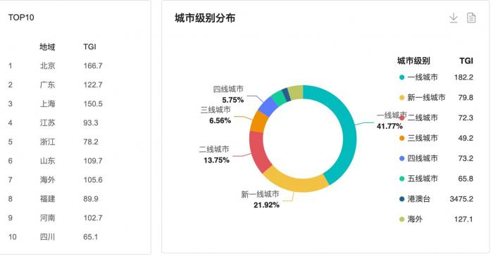 从关注人群的地域分布来看,北京市、广东省、上海市、江苏省、浙江省位居前五;从城市级别来看,位于一线、新一线城市的用户占比超过60%。