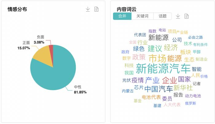 从热门话题的情感分布上来看,公众对“全国两会新能源汽车提案议案”政策的整体态度以中性和正面情绪为主,关注的内容焦点和热门话题集中在“雷军2022两会建议”“股票”等,通过微博热门评论分析发现,公众的评论热词为“新能源汽车”“新能源”“电动车”“基础设施”等。
