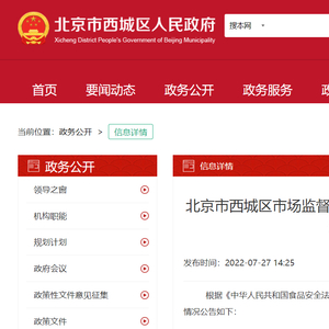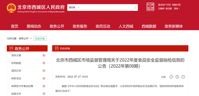 中国质量新闻网讯 7月27日,北京市西城区人民政府网站公布一条抽检信息,涉及北京市西城区市场监督管理局关于2022年度食品安全监督抽检信息的公告(2022年第08期)。