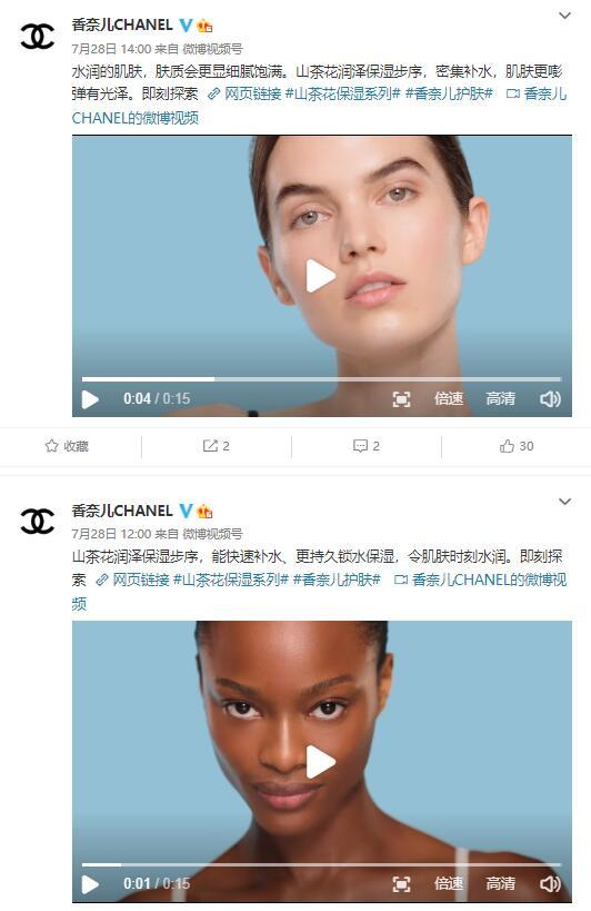 在同一天的不同时段,香奈儿品牌官方微博还发布了另两则山茶花保湿系列广告。