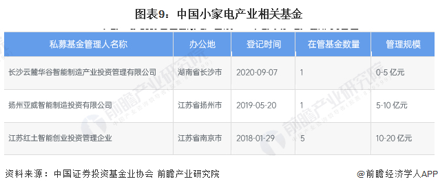 目前小家电行业的产业投资基金比较少,目前在中国证券投资基金业协会中仅查询到相关产业基金3家,主要均为智能制造领域的投资公司,在管基金数量较少,管理规模在0-20亿元之间。