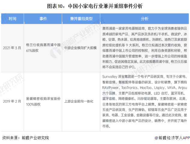 目前中国小家电行业的兼并重组事件减少,目前兼并重组的类型包括中游企业横向收购扩大规模、上游企业前向一体化。近年来重点事件包括家电企业格兰仕收购同业竞争对手惠而浦中国61%股权,业务得以协同扩大;五金产品研发商星徽精密收购电子产品研发商泽宝股份100%股权进入中游小家电销售市场。