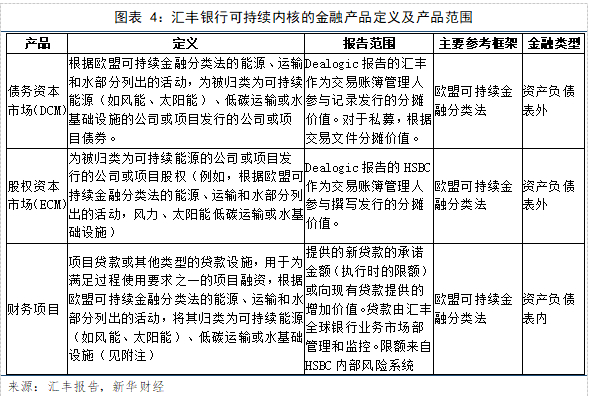 汇丰报告中的可持续融资产品范围包括:(1)融资解决方案,使客户能够转向可持续和低碳活动;(2)产品和服务包括承销、直接贷款、贸易和应收账款融资,具有符合市场既定原则的明确收益使用要求;(3)还包括与可持续性相关的设施,并应用了定义的可持续性绩效目标。