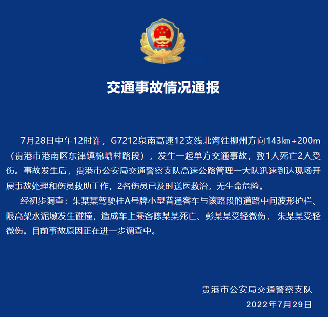 7月29日,广西贵港市公安局交警支队旗下微信公众号“贵港交警资讯”通报称,7月28日中午12时许,G7212泉南高速12支线北海往柳州方向143㎞+200m(贵港市港南区东津镇棉塘村路段),发生一起单方交通事故,致1人死亡2人受伤。事故发生后,贵港市公安局交通警察支队高速公路管理一大队迅速到达现场开展事故处理和伤员救助工作,2名伤员已及时送医救治,无生命危险。
