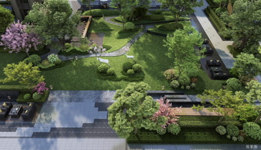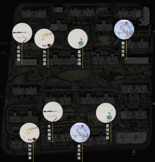 从主入口进入小区内,园林设计将“去行取意”,以济南名画《鹊华秋色图》为设计灵感,将现代手法与国风元素相结合,打造四大宅间景观组团:赏悦事、观山景、论禅语、入幽林,使得园林景观与建筑风格在视觉感知上相契合,在文化底蕴上相融合。
