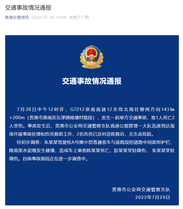 时代财经关注到,贵港交警资讯公众号7月29日下午14:08分发布一则通报,称28日12时许,其辖区内发生一起交通事故,1人死亡,两人轻伤无生命危险。经初步调查,事故发生原因为驾驶员朱某驾驶车辆与道路护栏、水泥墩发生碰撞。